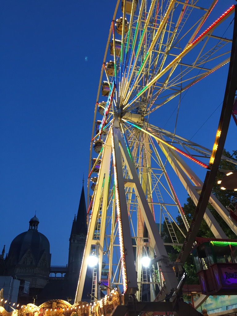 In Aachen rund um Dom und Rathaus ist meistens viel los. Aber derzeit, also bis Sonntag, 23. August, besonders. Und wer keine Lust auf Musik hat, kann einen Runde auf dem Riesenrad drehen. Es steht auf dem Katschhof und sorgt für pittoreske Bilder. Der Andrang zum Riesenrad ist bei Dunkelheit groß, die Warteschlange entsprechend lang.