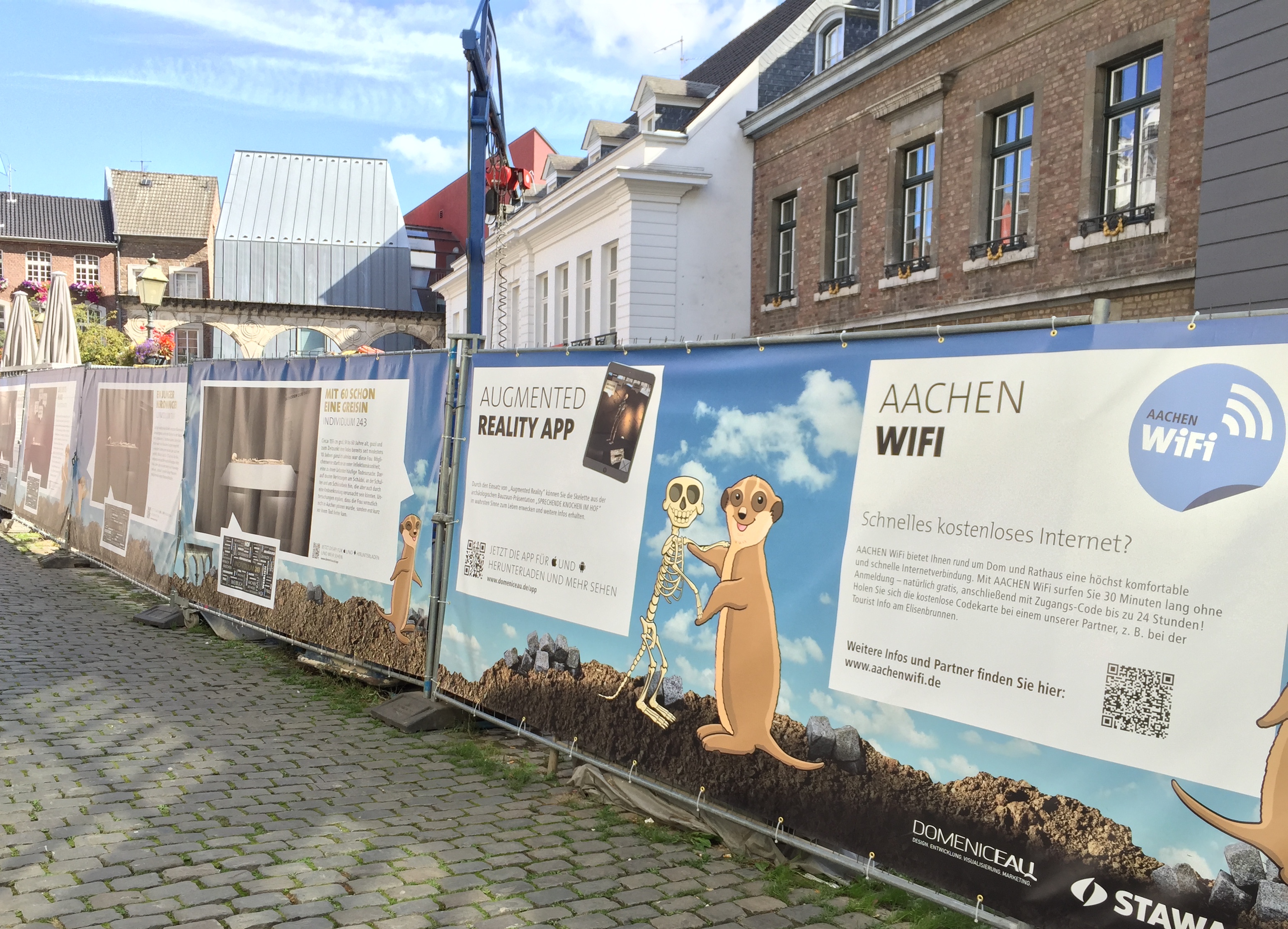 In der Klappergasse/Ecke Jakobstraße geht es um Wasser, das dem Fußgänger im Bild schwallartig entgegenschwappt. Im Hof wird der Passant über das „Individuum 243“ informiert, das dort gefunden wurde, über eine neue „Augmented Reality App“, das Aachen WiFi, also schnelles kostenloses Internet und vieles mehr. Und auf dem Markt sehen wir die Baustelle selbst abgebildet.