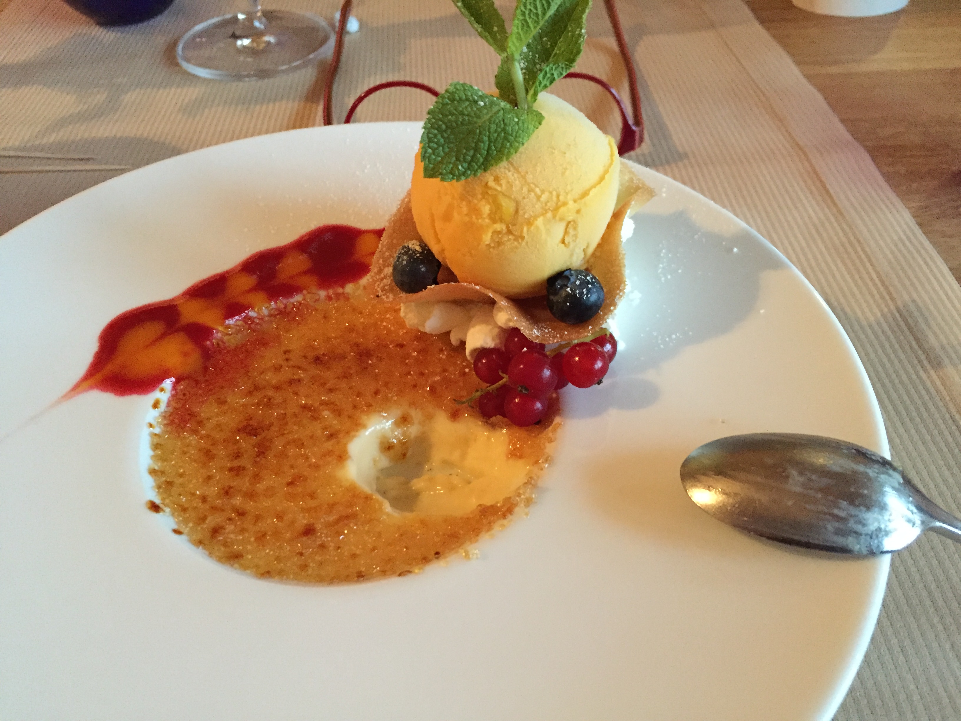 Eine feine Adresse ist das „Haus am See“ in Aachen, dort kann man toll (und teuer) essen und dabei auf’s Wasser schauen. Einmal wurde ich von einer großzügigen Dame dorthin eingeladen. Es schmeckte so gut, dass ich schließlich einen guten Freund überreden konnte . . . Unten abgebildet: Die Nachspeise, Creme brûlée.
