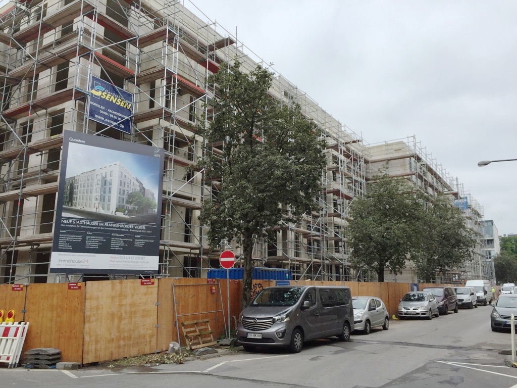 Mal sehen, ob da für mich ne Wohnung dabei ist, dachte ich mir und spazierte ins Frankenberger Viertel zu den jetzt „Frankenberger Höfe“ genannten Neubauten (s. Foto unten). Da, wo früher das Finanzamt Rothe Erde stand, wurden über 200 Wohnungen hochgezogen, die meisten ohne Wohnberechtigungsschein. Das Ergebnis: Nicht schlecht, aber viel zu teuer für mich. Wirklich absurd teuer, dafür, dass man in einer solchen Klotz-Anlage wohnen soll, finde ich. Bei der gegenwärtig laufenden Ausstellung im Aachener Zeitungsmuseum (Pontstraße) könnt ihr ähnliche Gebäude unter dem Motto „Vorbildliche Bauten“ sehen. Nun ja, was die Architektenwelt für „vorbildlich“ hält.
