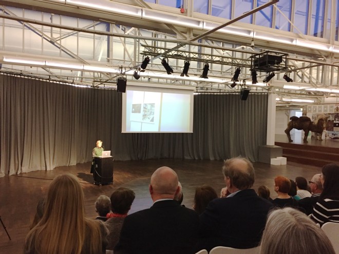Die Mulde mit neuem, raumteilenden Vorhang, fotografiert bei der Eröffnung der Fotoausstellung. Am Rednerpult: Dr. Margrethe Schmeer,  Vorsitzende des Betriebsausschusses Kultur in Aachen.