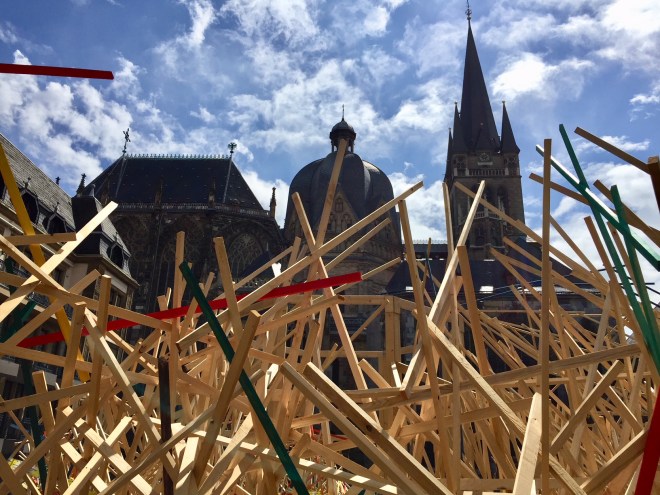 Nur noch bis Sonntag, 19. August, einschließlich zu sehen: eine wilde Bastelarbeit auf dem Katschhof, dem Platz zwischen Dom und Rathaus in Aachen. Direkt daneben befindet sich ein überdimensionierter Sandkasten mit feinem weißen Sand, ebenfalls nur noch bis Sonntag.
